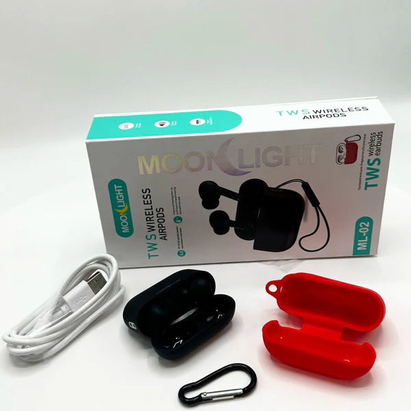 MOON LIGHT TWS Wireless AirPods 5.0 deliver high-quality, lossless sound with a fast and stable Bluetooth 5.0 connection. With up to 5 hours of listening per charge and 25 hours with the charging case, enjoy uninterrupted music all day. Comes with an anti-fingerprint silicone case for added protection.
